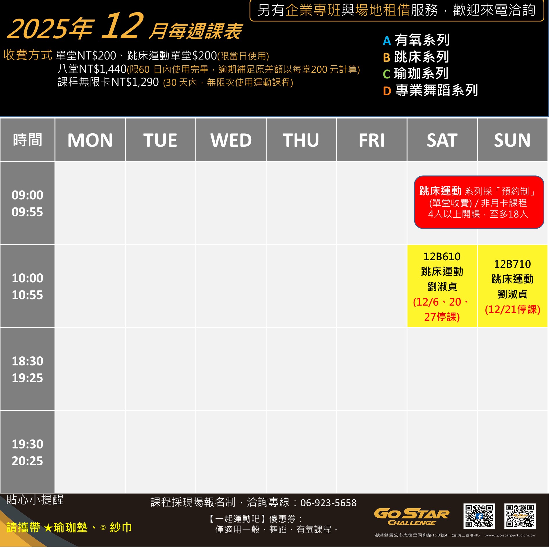 12 月跳床課表出爐囉! 課程採【預約制】,每班名額有限,請盡速報名!